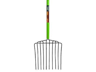 Large Pitchfork for durable wooden stem and metal grip for moving mulch.