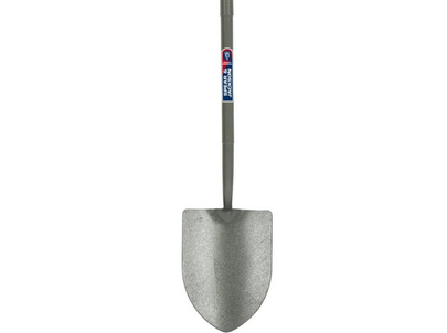 Round Edge Shovel with durable wooden handle for trenching, moving compost and mulch, and other general purpose landscaping jobs.
