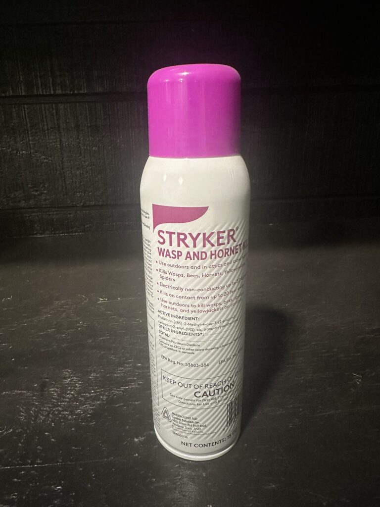 15 oz. Spray can – Kills wasps, bees, hornets, yellowjackets, and spiders. Kills on contact from up to 20 feet away.